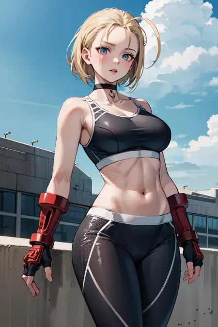 アウトフィット3(ジャケットなし)cammy white, short hair, antenna hair, blue eyes, scar on cheek, large breasts, black choker, collarbone, sports bra, midriff, fingerless gloves, black gloves, black pants