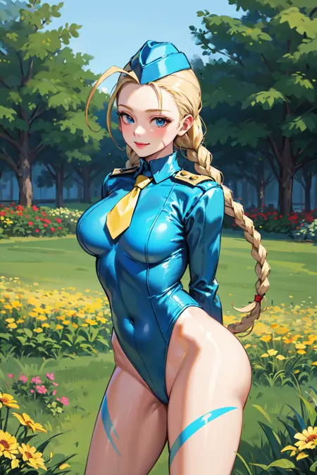 アウトフィット2cammy white, twin braids, long hair, blonde hair, antenna hair, garrison cap, blue headwear, blue eyes, scar on cheek, large breasts, yellow necktie, (blue leotard:1.1), long sleeves, fingerless gloves, bodypaint