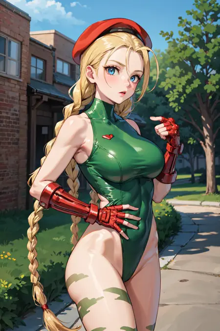 アウトフィット1cammy white, twin braids, long hair, blonde hair, antenna hair, beret, (red headwear:1.3), blue eyes, scar on cheek, large breasts, green leotard, sleeveless, red gloves, fingerless gloves, camouflage