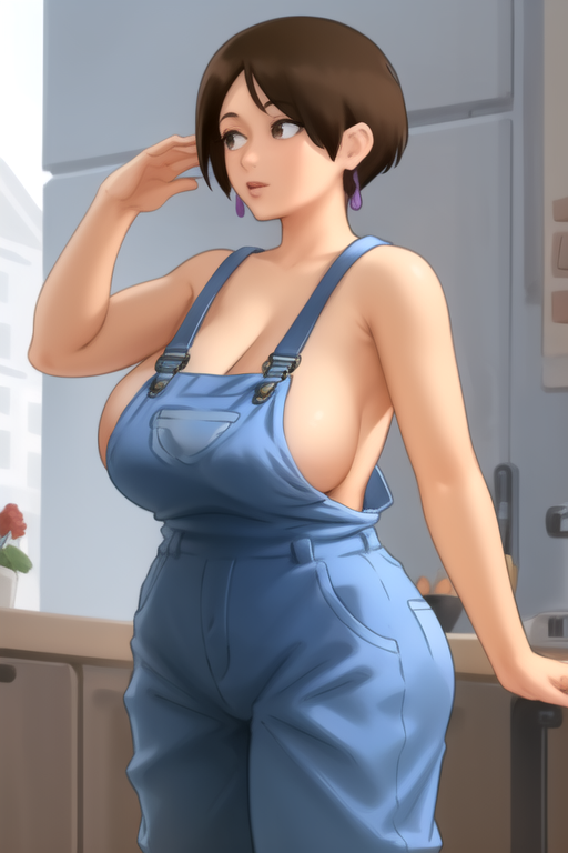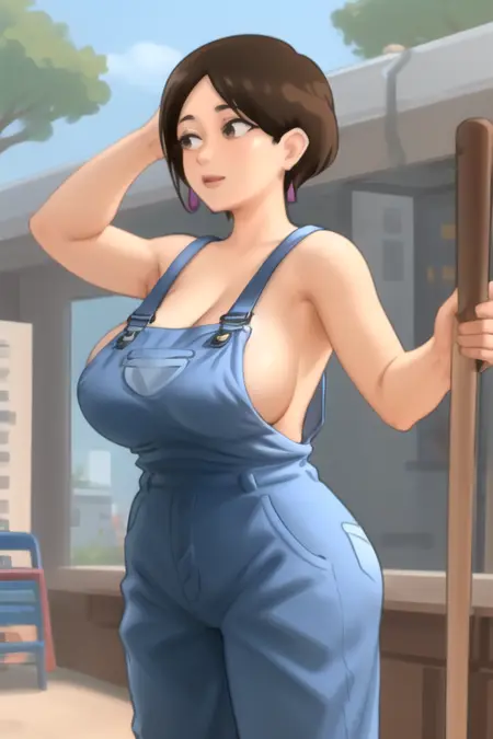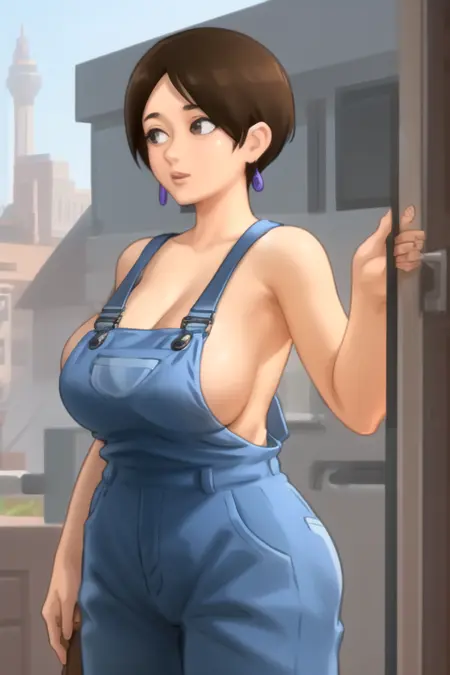 DianeSumm3rtime, 1girl, solo, short hair, large breasts, brown hair, brown eyes, sideboob, mature female, blue overalls, naked overalls, bare shoulders