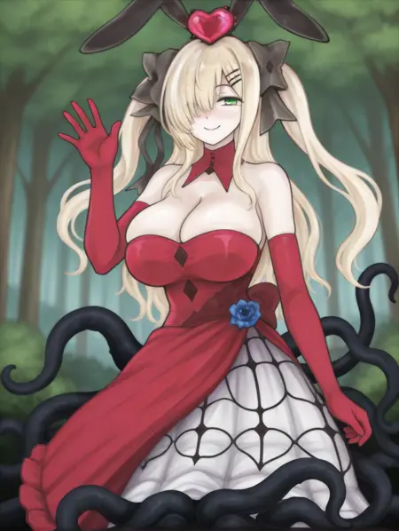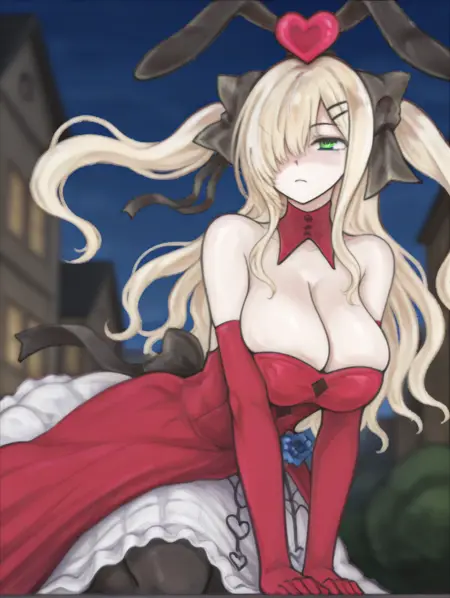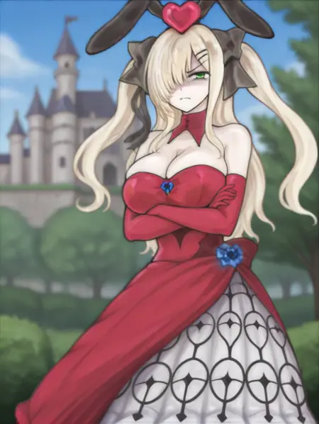 Alice9, DefAlice, 長い髪, 金髪, 片目を覆う髪, 緑の目, 大きな胸, 赤いドレス, 白いスカート, 赤い肘手袋, 黒い髪リボン, 髪飾り, 頭上にハート, 偽の黒いウサギの耳, 胸元、