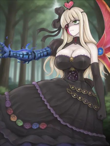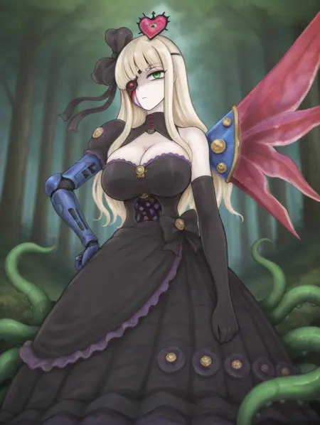 Alice9, ReaAlice, 長い髪, 金髪, 目を覆う, 目パッチ, 緑の目, 大きな胸, 青い義肢の腕, 片翼, 黒いドレス, 黒い肘手袋, 黒い髪リボン, 髪飾り, 頭上にハート, 胸元、