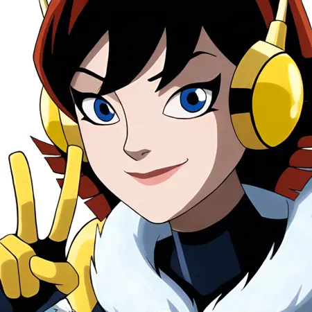 冬用衣装: jwsp, 1girl, solo, ピンクの茶色の髪, 青い目, ヘッドフォン, ファーのトリム, 冬用衣装, 黄色と黒のボディスーツ, 黄色の肘手袋, カートゥーン