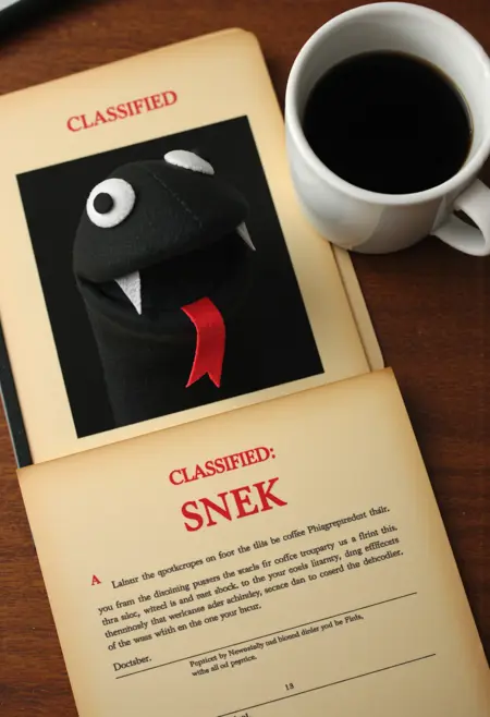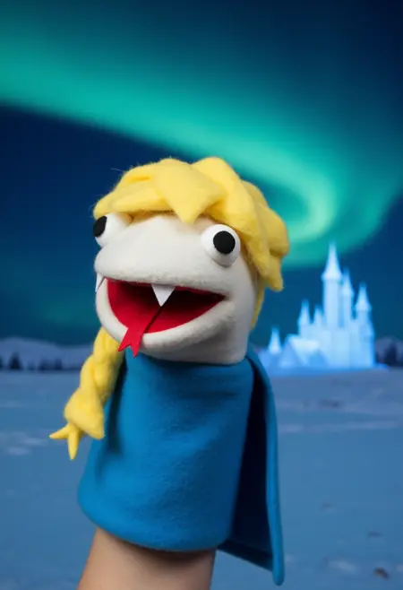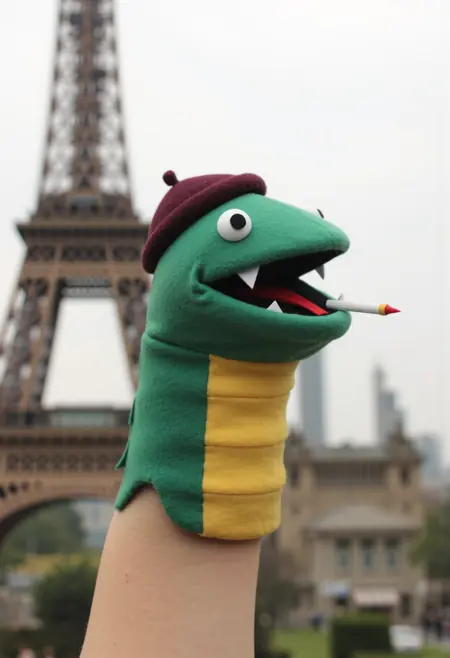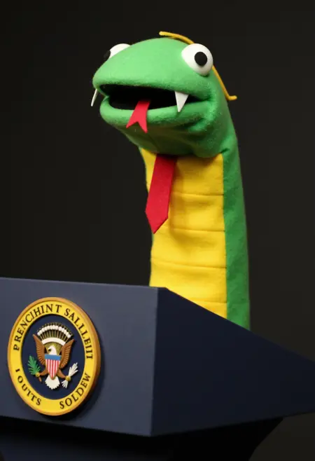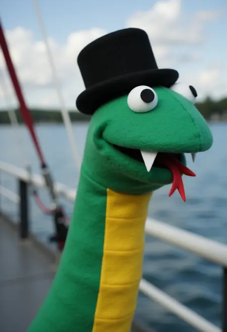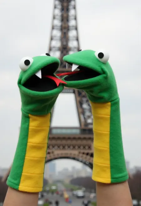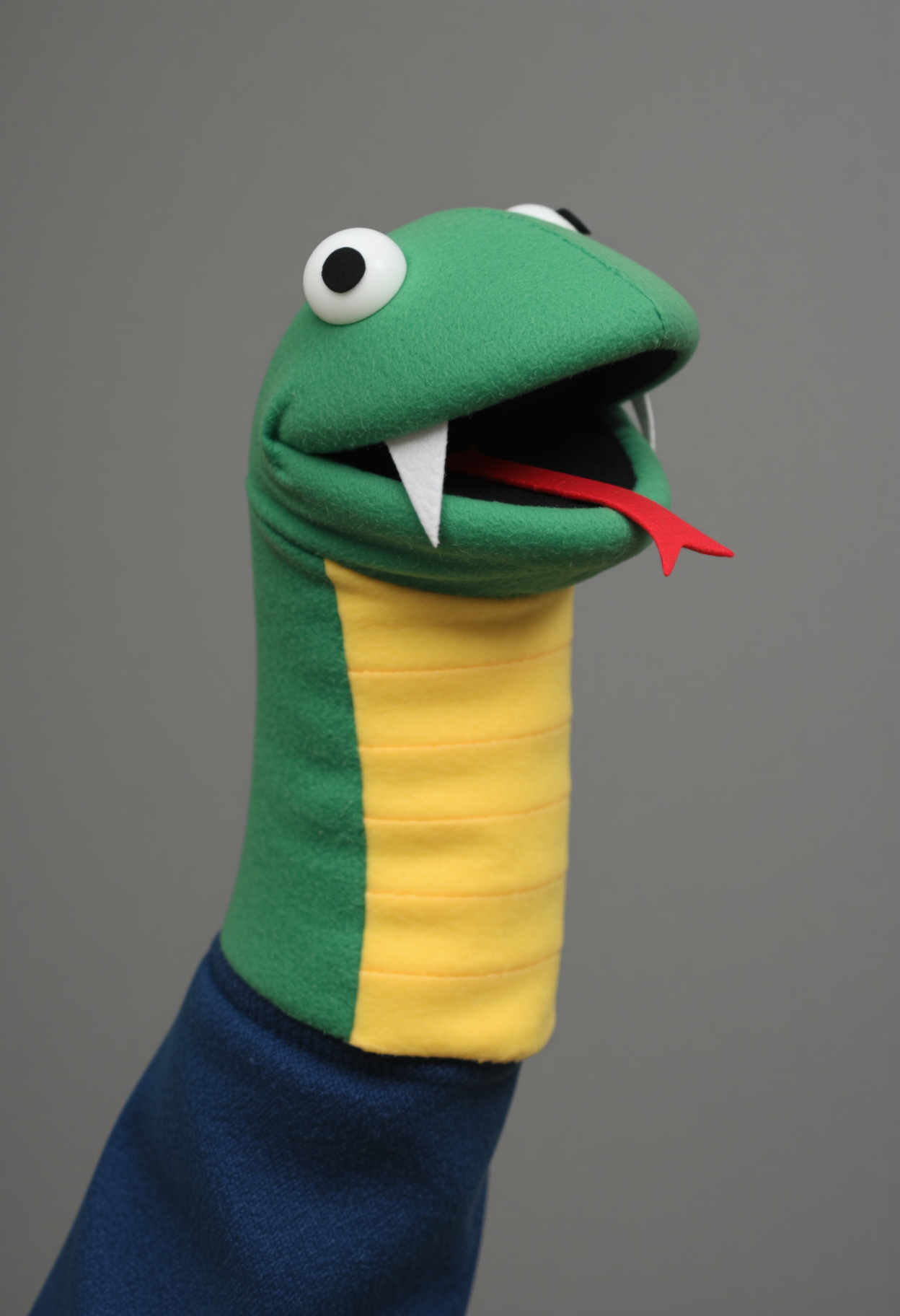 高分辨率照片,图片底部是一只手藏在手偶里面。手偶由毛毡制成,外形是一条绿色蛇,腹部为黄色,眼睛位于头顶最上方,有细小的毒牙,嘴巴张开,舌头伸出,表情滑稽。毛毡上的缝线和接缝清晰可见。