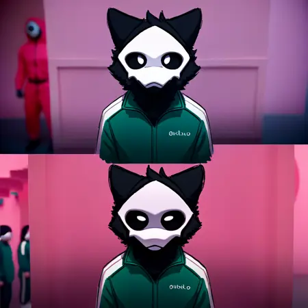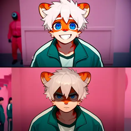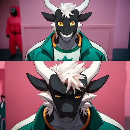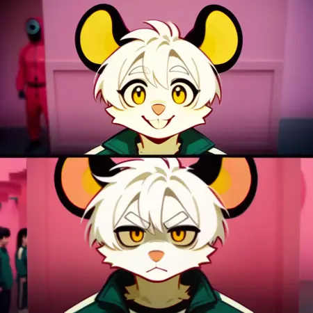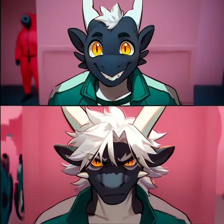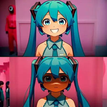 mikus-concept, smiling expression, BREAK, serious expression, BREAK, comparison, pink background, partially shaded face, green jacket, upper body, blurry background, comic, looking at viewer, meme