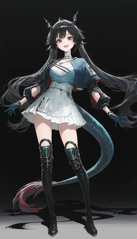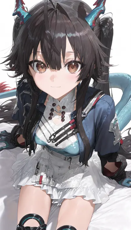 棕色眼睛,黑色头发,龙角,龙尾,双马尾,
