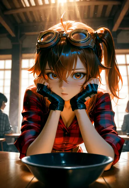 red shirt, plaid shirt, sleeves rolled up, brown pants, belt,