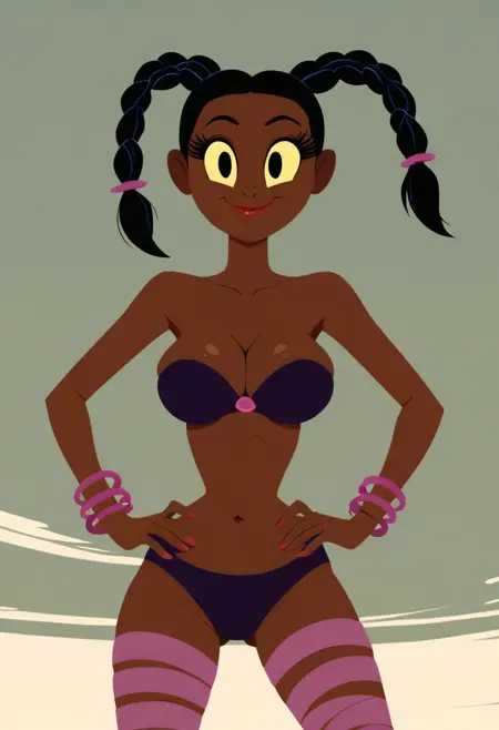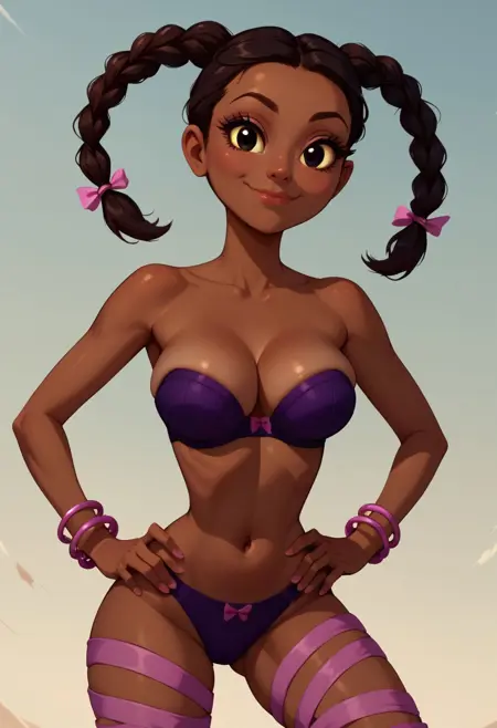1girl, Solo, Ravegirl_SJ, brown skin, black eyes, black hair, two long braids, long eyelashes, pink hairties