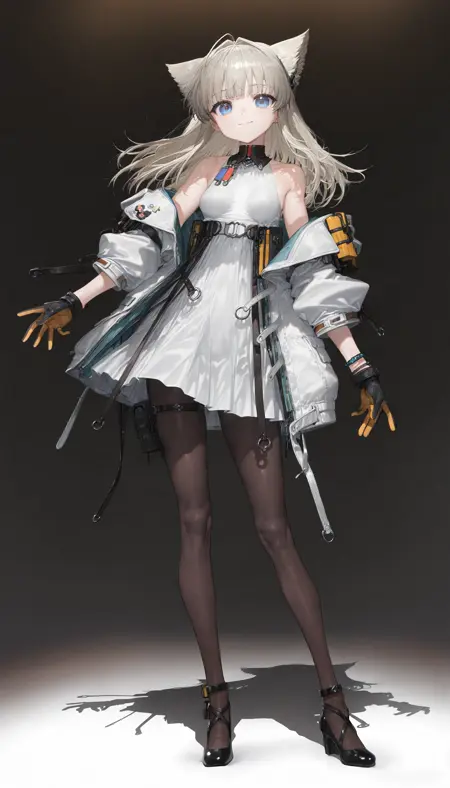 開いたジャケット、袖なしのドレス、黒い手袋、黒いパンティーストッキング、ハイヒール、ベルト,
