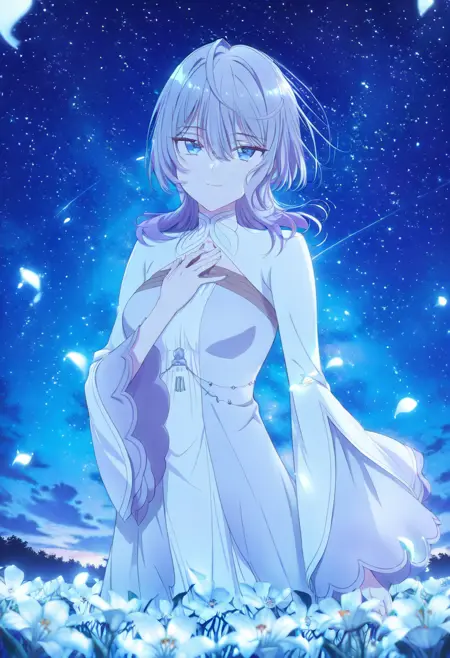 Philia Adenauer (Main Character) - zzPhilia, 1girl, solo, purple eyes, purple hair, medium hair, bangs, long sleeves, dress, hair between eyes, wide sleeves, white dress, white footwear, purple dress, long dress,