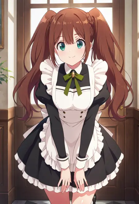Rina Aulpus (Maid) - zzRina, 1girl, solo, blue eyes, brown hair, long hair, twintails, bangs, long sleeves, dress, ribbon, braid, puffy sleeves, socks, black footwear, black dress, white socks, neck ribbon, juliet sleeves, apron, white apron, maid apron, frilled apron, mary janes, green ribbon, green eyes,