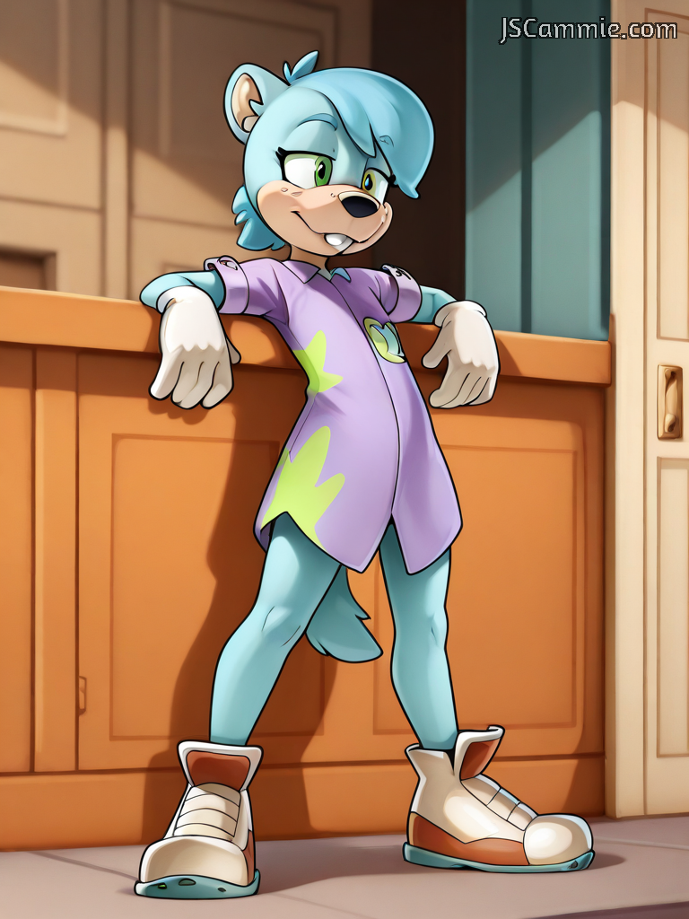 dave the intern, standing, 1boy, male, furry, freckles, blue nutria, blue hair, buckteeth, green eyes, animal nose,