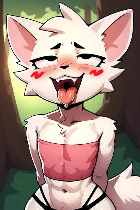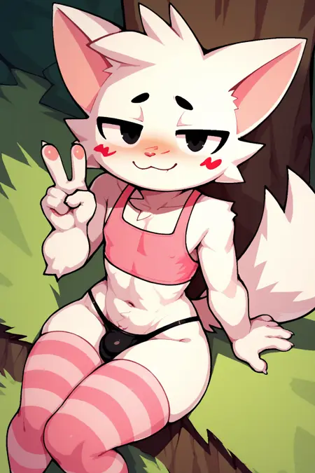 ➜ BoyKisserPXL, anthro furry, furry male, body fur, white fur, black eyes, animal ears, cat ears, blush stickers, flat chest, white tail, pink thighhighs, striped thighhighs, socks