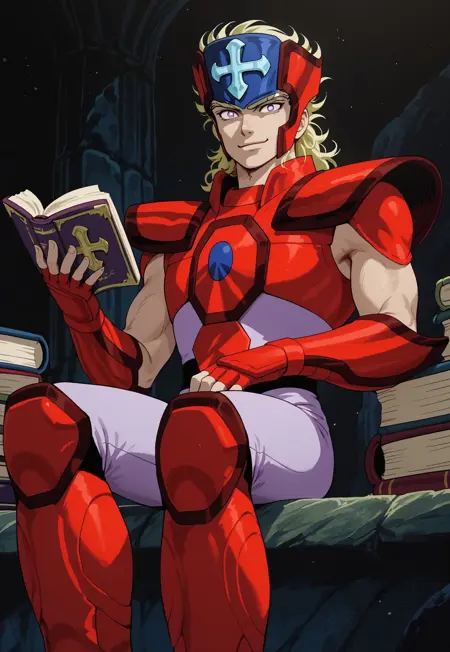1boy, muscular, toned male, wavy hair, blonde hair, cross circlet, red breastplate, red pauldrons, red vambraces, red fingerless gloves, light violet undershirt, light violet pants, red thighhigh greaves, unibrow, dilated pupils