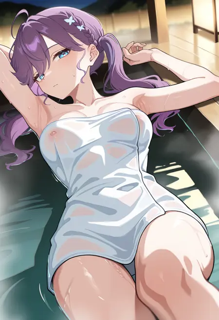 default:purple hair,blue eyes,twintails,braid,hair ornament
