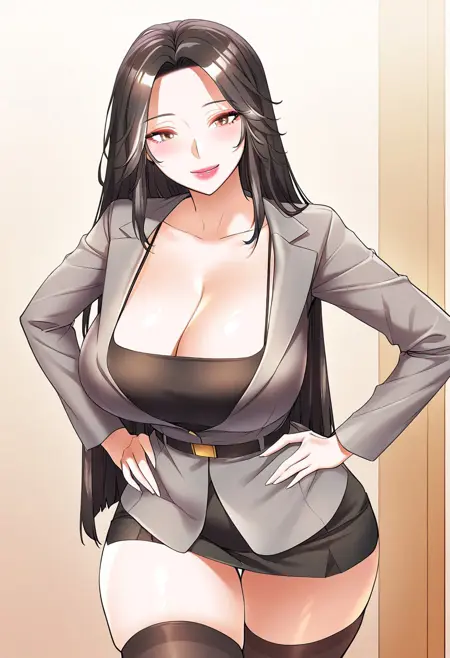 2. ((灰色西装外套配黑色腰带,性感短款黑色背心,淫秽深乳沟,巨大乳沟,性感短款黑色铅笔裙,性感透黑过膝长筒袜,)) 带小吊坠的项链,露脐,红色乳胶豪华手袋配金色链条肩带,黑色豪华太阳镜,