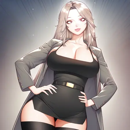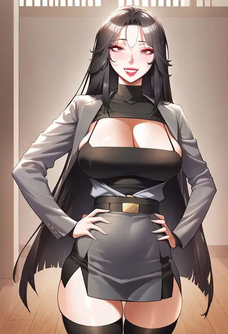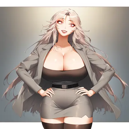 ((グレーのスーツジャケット、黒いベルト、セクシーな短い黒いキャミソール、下品な胸元、大きな胸元、セクシーな短い黒い铅筆スカート、セクシーな透け感のある黒いタイツ)、小さなペンダント付きのネックレス、お腹、金チェーンストラップの赤いラテックス高級バッグ、高級な黒いサングラス)