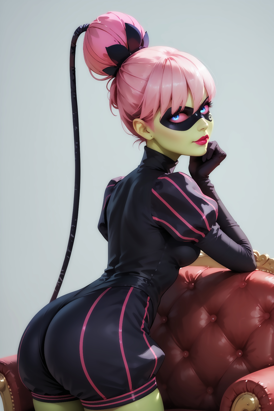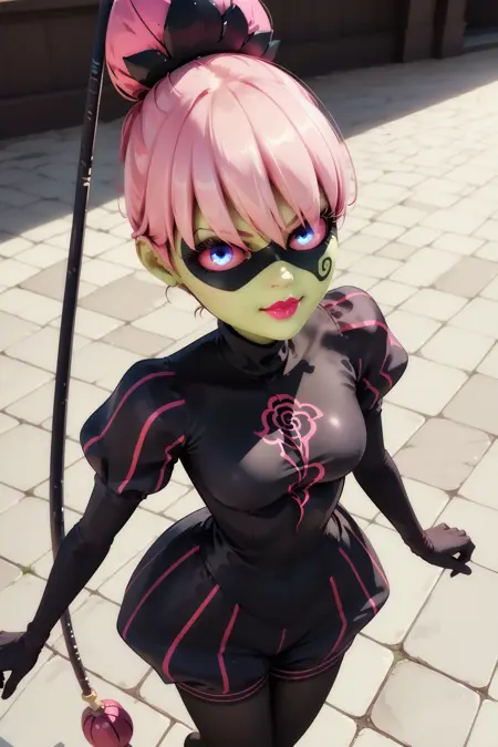 正向提示词:1girl, pink hair, colored skin, green skin, pink sclera, blue eyes, single hair bun, hair bun, makeup, lipstick