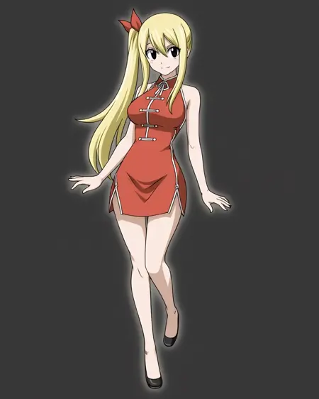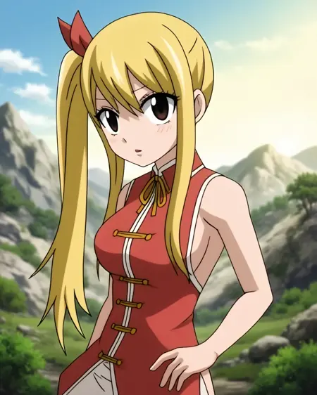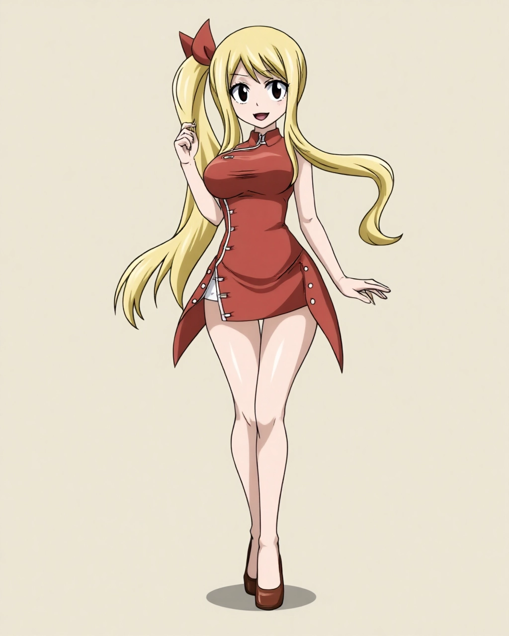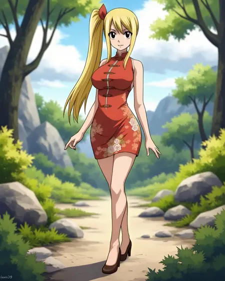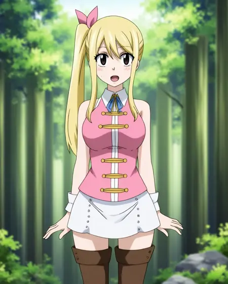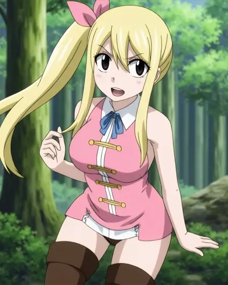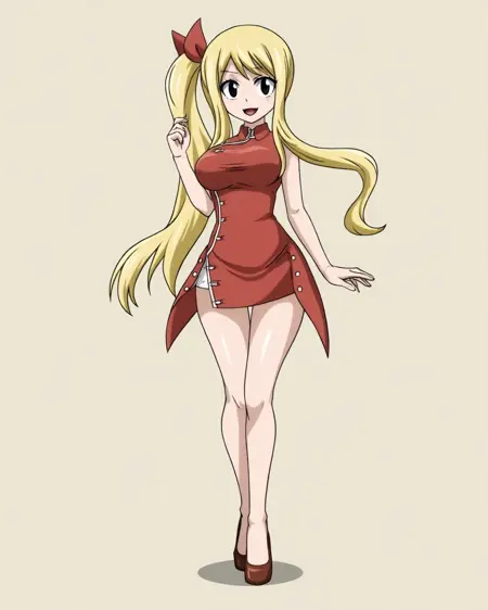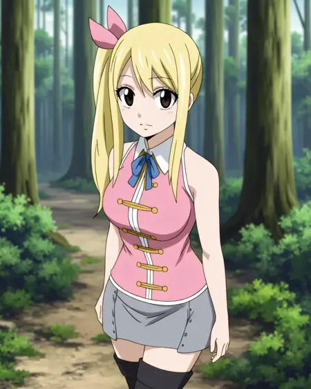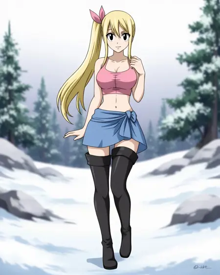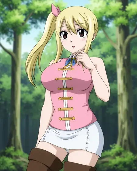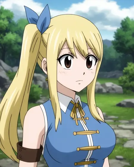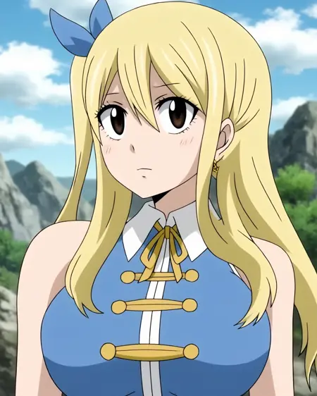 Tips Classic Costume: "There is a character named luxi09. She has long blond hair tied into a ponytail with a blue ribbon, and wears a blue turtleneck sleeveless shirt with a white lapel, a gold bow ribbon on the collar, gold buttons and a gold tie with white trim. She wears a light green belt around her waist and brown over-the-knee boots."