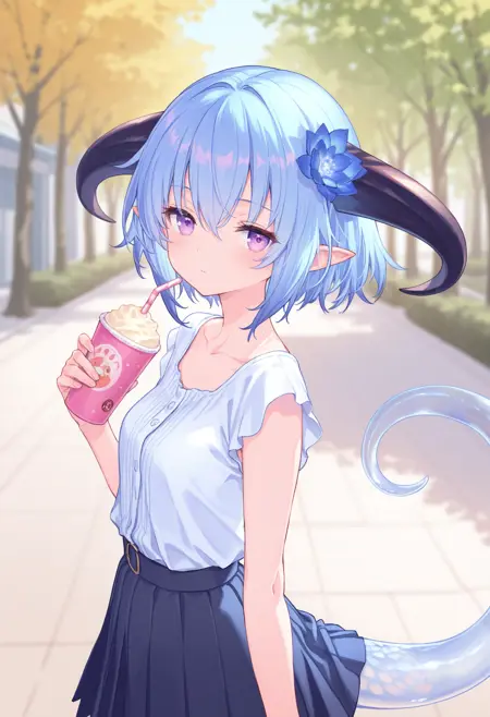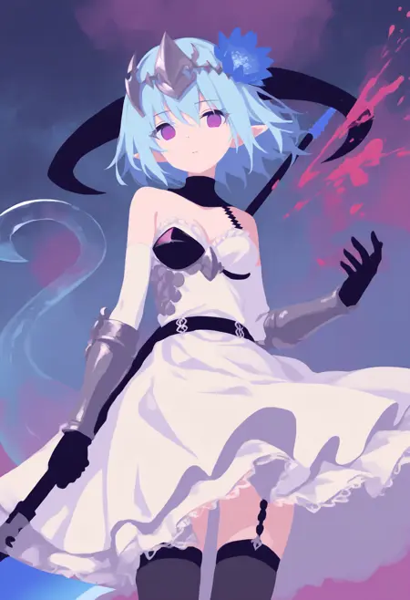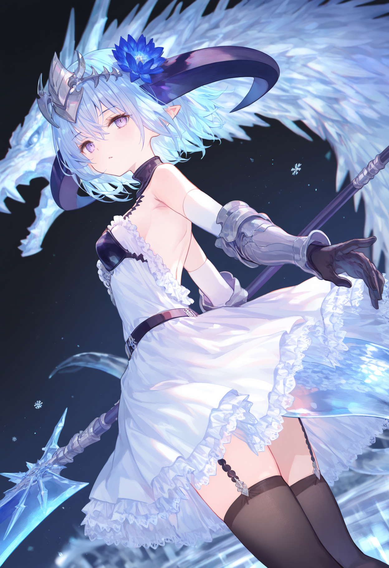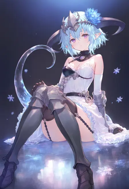 파란 머리, 단발, 보라색 눈, 뿔, 뾰족한 귀, 머리에 꽃, 머리장식, 목걸이, 어깨 노출, 비대칭 가슴 보호구, 흰색 드레스, 프릴, 투명한 꼬리, 허벅지 스타킹, 허벅지까지 오는 양말, 갑옷 부츠, 흰색 분리형 소매, 장갑, 검은 장갑.