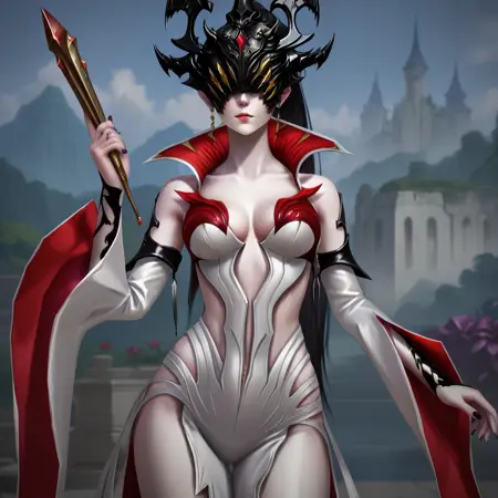 lostark_Agris, 1girl, solo, long hair, detached sleeves, dress, wide sleeves, bare shoulders, black hair, helmet, covered eyes, pale skin