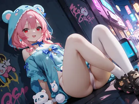 futiya01,1girl,solo,hood,thighhighs,pink hair,red eyes,socks,single thighhigh,blue underwear,single sock,looking at viewer,animal hood,panties,white thighhighs,brown Animal Shoes,
