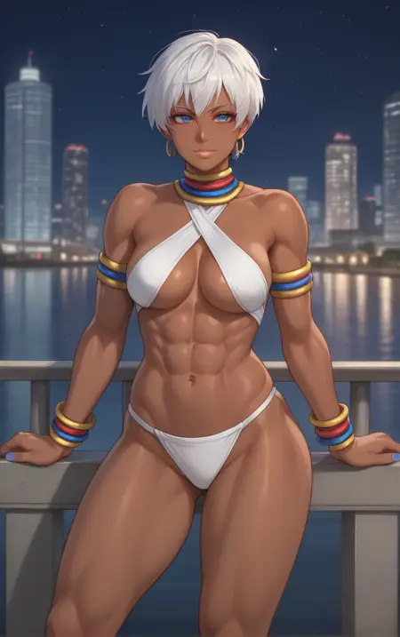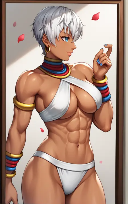 1girl, blue eyes, breasts, dark-skinned female, hoop earrings, jewelry, lips, neck ring, short hair, toned, white hair, very dark skin, earrings, medium breasts, nail polish, blue nails, muscular, abs, nose, dark skin, bangs, legs, thighs,