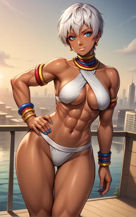 1girl, blue eyes, breasts, dark-skinned female, jewelry, neck ring, short hair, toned, very dark skin, white hair, armlet, bracelet, large breasts, lips, abs, hoop earrings, muscular, nose, thighs, collarbone,