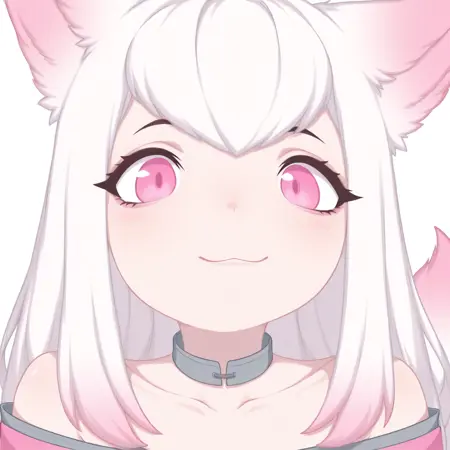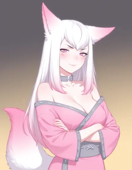 Promt: Marie-vkstickrs, white hair, fox ears, pink kimono, grey edges, grey collar, grey belt, pink tips, pink eyes, tail, bare shoulders, rolled-down sleeves.