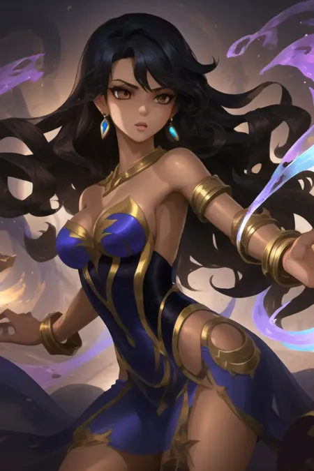 EsmeraldaMLBB, 1girl, long hair, medium breasts, black hair, blue dress, cleavage, bare shoulders, brown eyes, jewelry, earrings, dark skin, armor, bracelet, dark-skinned female, strapless, armlet