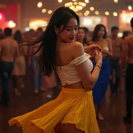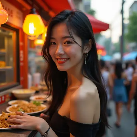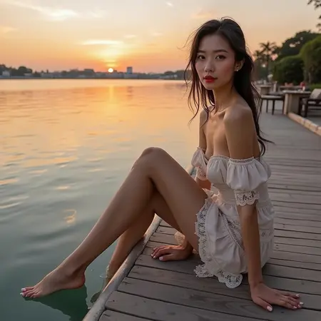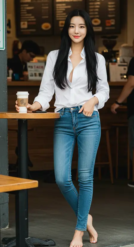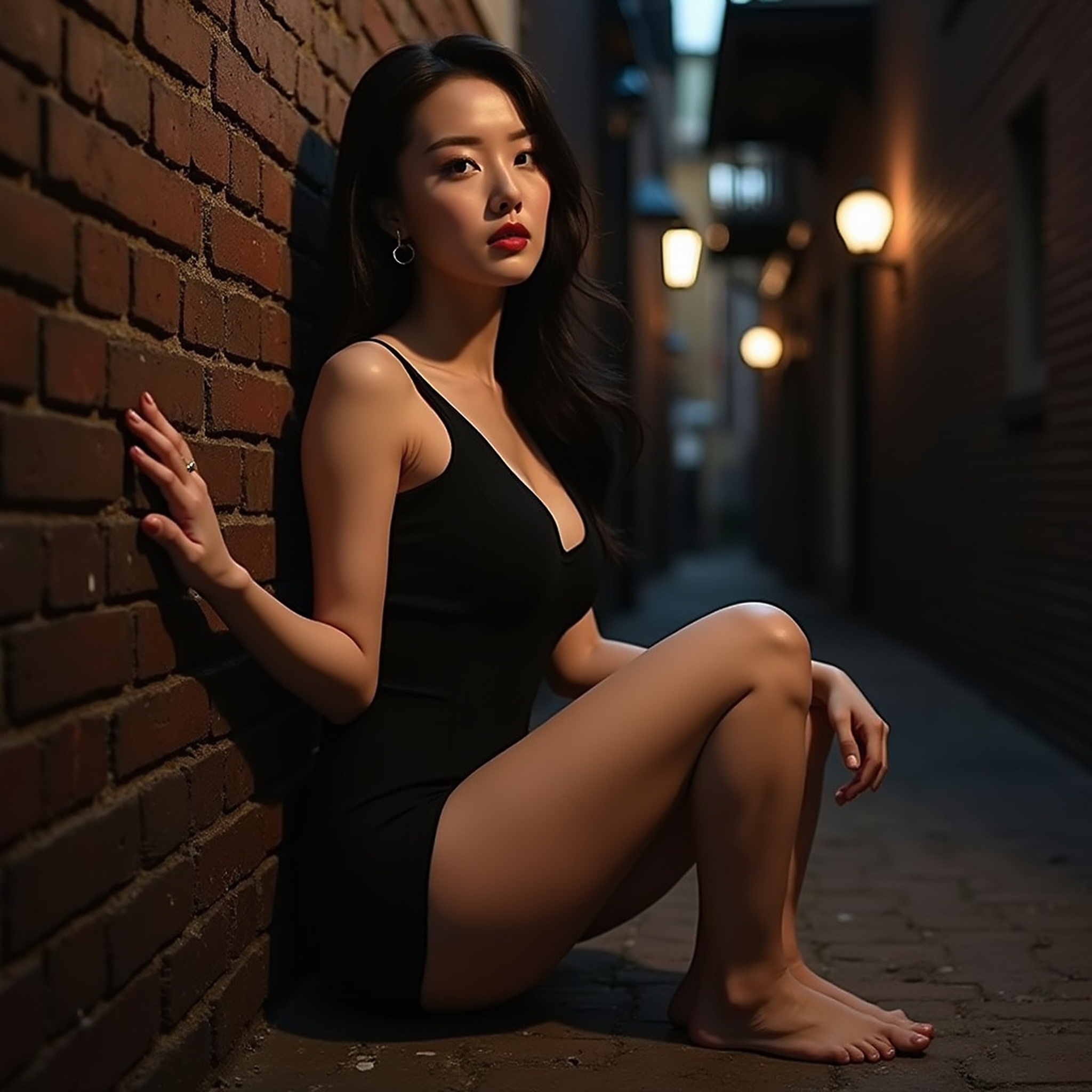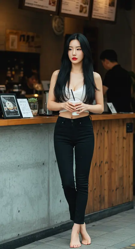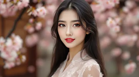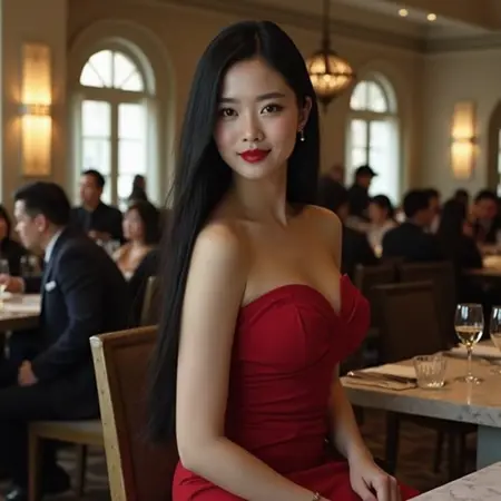 An extraordinarily beautiful South Korean, elegantly dressed, but still provocative. The woman has strikingly defined and quintessentially Asian features. Her straight, jet-black hair flows effortlessly down her back, stopping just short of her waistline. Her skin is smooth and luminous, with a porcelain-like clarity that glows naturally. Her almond-shaped eyes are slightly tapered and framed by long, dark lashes, conveying a deep sense of elegance and mystery. She has a delicate, symmetrical oval face with high cheekbones and a softly rounded jawline. Her nose is petite and refined, complementing her graceful features. Her lips are perfectly shaped, slightly fuller on the bottom, and form a serene, soft smile with a heavy red lip gloss to go with her medium makeup. She has size 7 should and a small bust, 34B size. She exudes an aura of traditional Asian elegance.