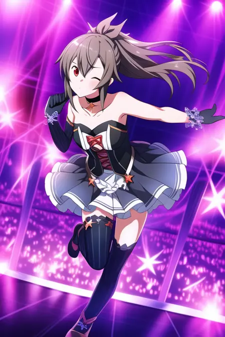 - 아이돌: EYDIS, 1girl, solo, 긴 머리, 치마, 갈색 머리, 빨간 눈, 허벅지 스타킹, 잡고 있음, 눈 사이 머리카락, 뒷목뼈, 언덕머리, 머리끈, 하트, 초커, 검은 장갑, 팔꿈치 장갑, 줄무늬, 별(기호), 젯타이 릿키, 스트랩리스, 떠다니는 머리카락, 스트랩리스 드레스, 줄무늬 허벅지 스타킹, 아이돌, 무대, 플라스틱 막대기, 키스 날리기,