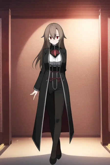 - 기념일 갑옷: EYDIS, 1girl, solo, 긴 머리, 갈색 머리, 빨간 눈, 장갑, 눈 사이 머리카락, 언덕머리, 부츠, 넥타이, 검은 장갑, 바지, 검, 손가락 없음 장갑, 망토, 무기 잡고 있음, 갑옷, 검은 리본, 떠다니는 머리카락, 찡그린 얼굴, 검 잡고 있음, 검은 바지, 높은 언덕머리, 어깨 갑옷, 칼집, 팔더런, 가슴판, 갑옷 부츠, 회색 망토,