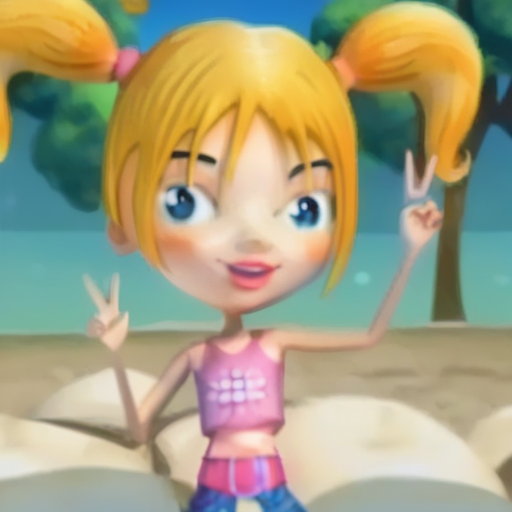 solo, 1girl, ブロンド髪, 青い目, ファー付きピンクのジャケット, 青いジーンズ, ピンクのブーツ, 短いツインテール, 白い手袋スタンダード