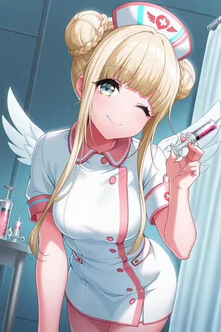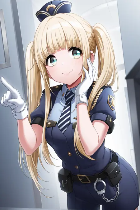 noa, 1girl, solo, detached sleeves, smile, blonde hair, breasts, skirt, bangs, looking at viewer, salute, hand on waist, white skirt, white sleeves, stage outfit, on stage