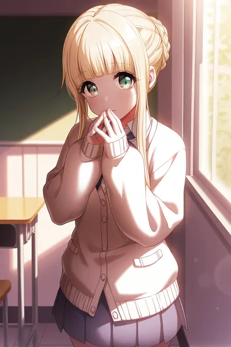 noa, 1girl, solo, skirt, blonde hair, school uniform, green eyes, pleated skirt, looking at viewer, cardigan