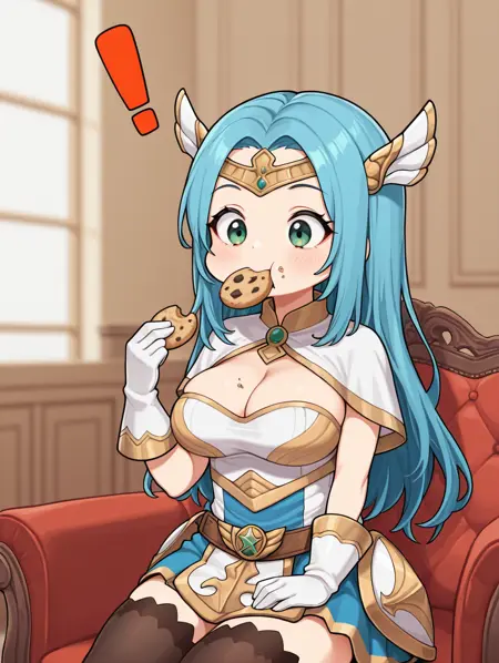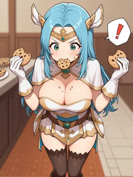 erina, 1girl, solo, long hair, large breasts, thighhighs, gloves, green eyes, blue hair, food, black thighhighs,