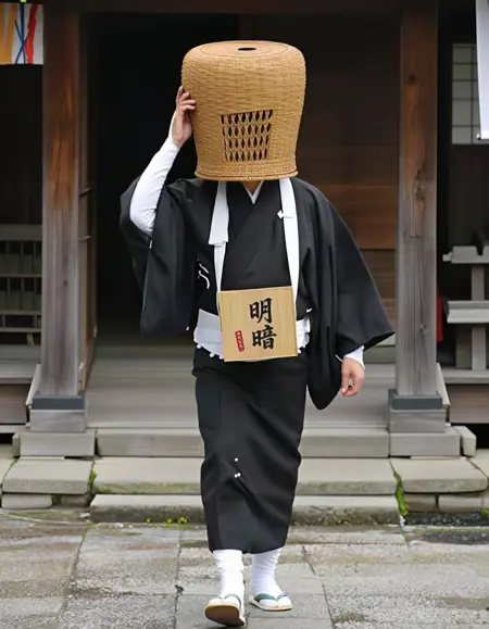 그들은 허리에 가사를 입고, 목에 "偈箱"라고 쓰인偈箱이나 짚자루 주머니를 매달며, "천개(天蓋)"라 불리는 바구니 모양의 대나무 모자를 썼다.
