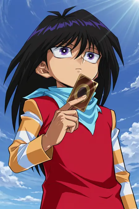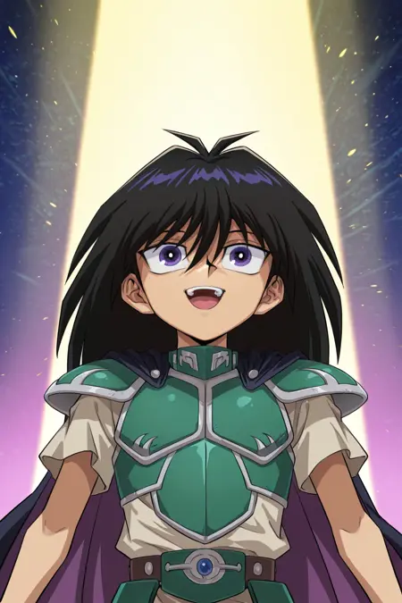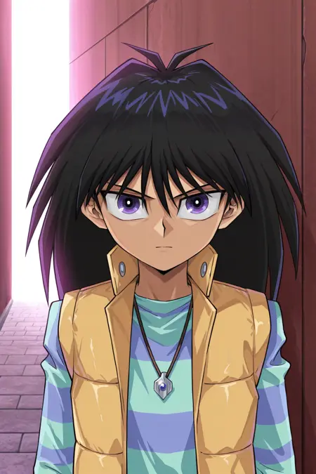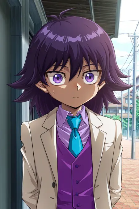 *モクバ・ダイム、黒髪、紫の目、白いジャケット、紫のシャツ、紫のベスト、青いネクタイ、紫のズボン、茶色の靴