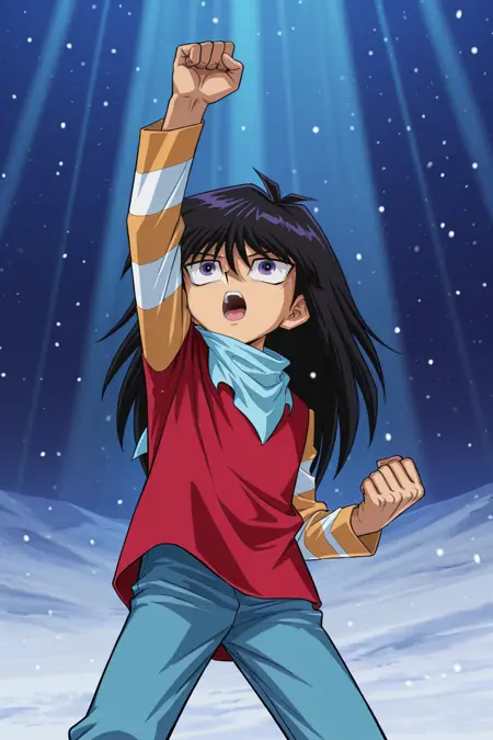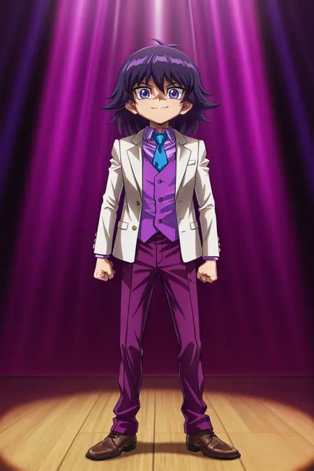 *모쿠바_다임, 검은 머리, 보라색 눈, 흰색 재킷, 보라색 셔츠, 보라색 조끼, 파란색 넥타이, 보라색 바지, 갈색 신발