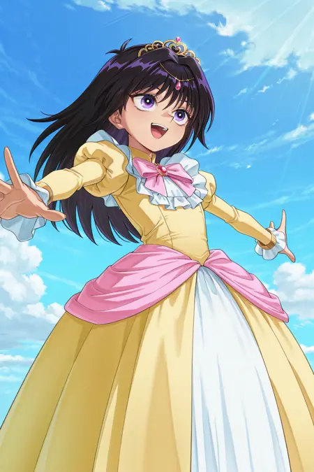*黄色にピンクのドレス、ピンクのリボン、ティアラ、男の子、女装、サークレット、ジュリエット袖