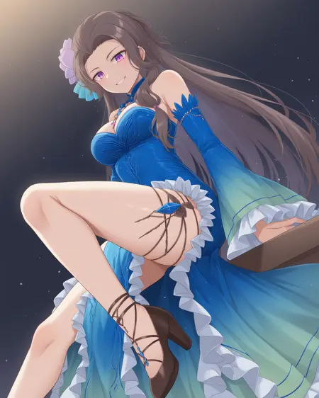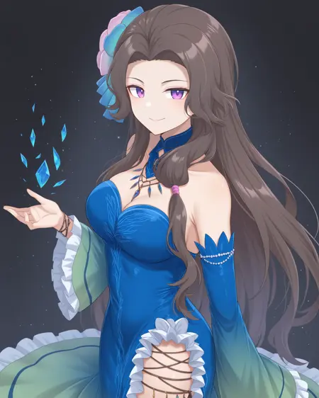 <lora:VitaClotildeCS1_Illustrious:1>, Vita Clotilde, 濃い茶色の髪, 長い髪, 紫色の目, 大きい胸, 髪飾り, 髪の花, 青いドレス, 別れ袖, 肩出し, ジュエリー, ヒール,