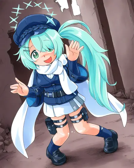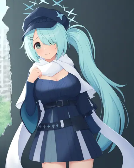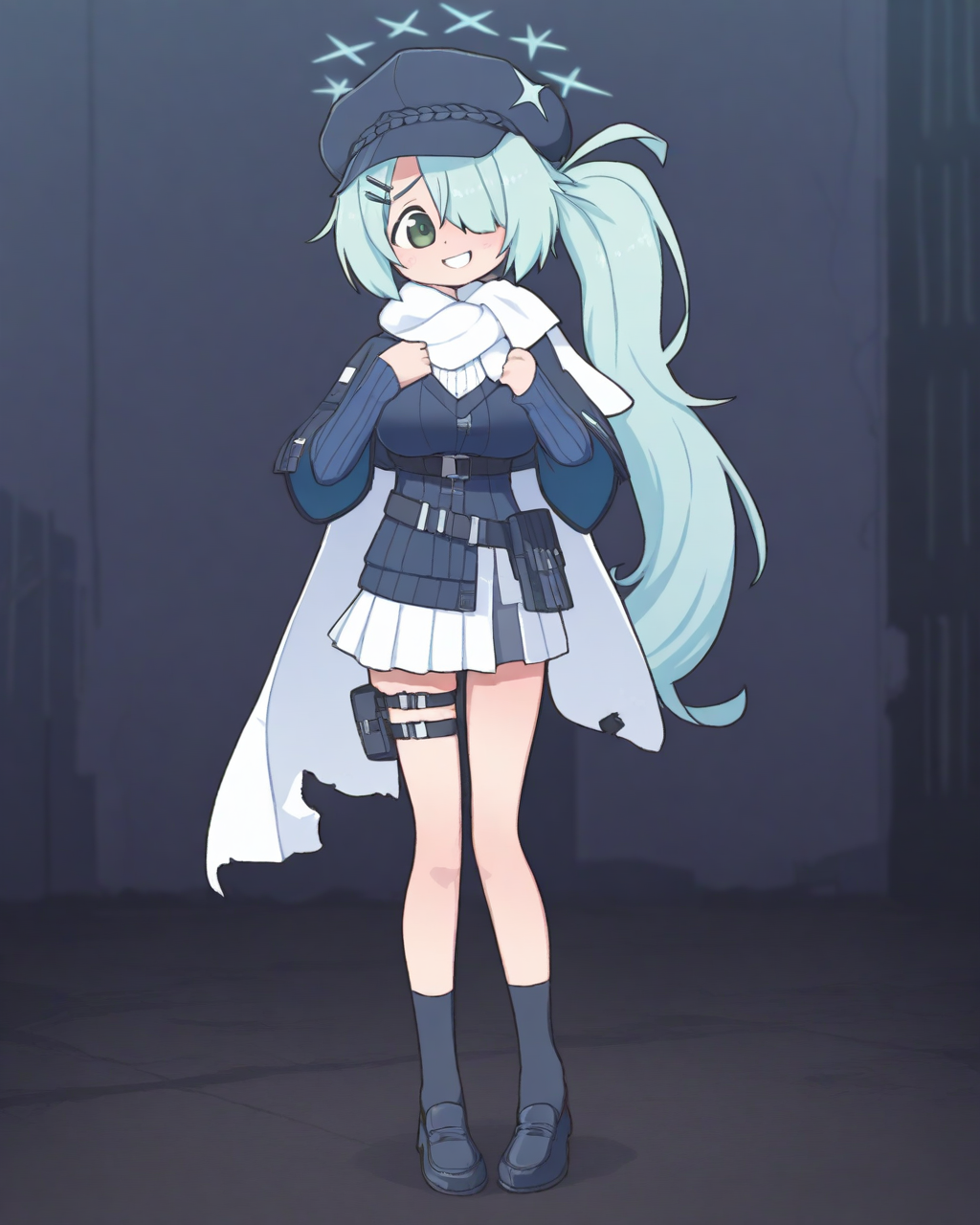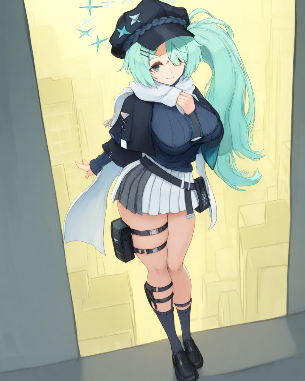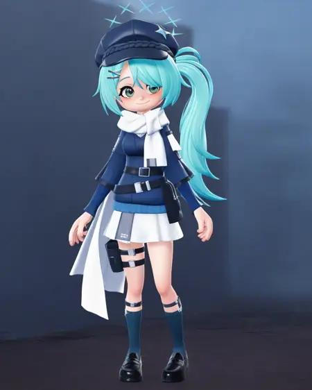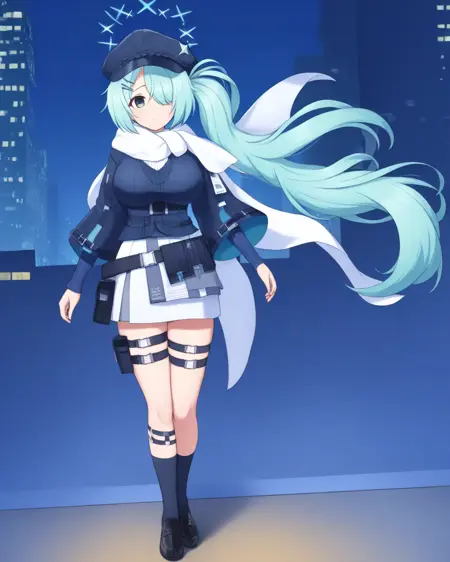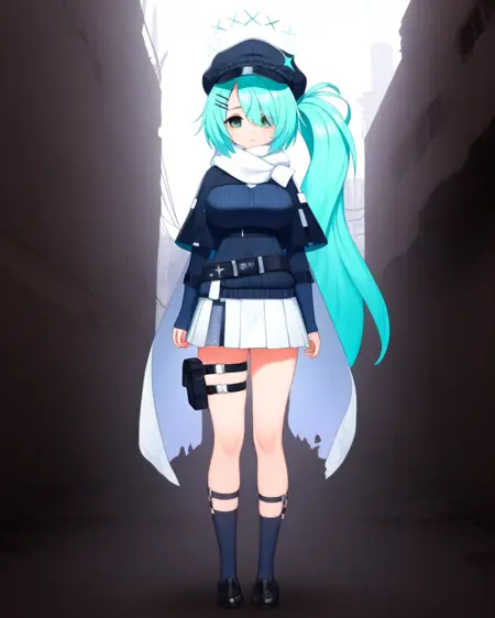 通常: hiyoricasual, halo, green eyes, aqua hair, asymmetrical bangs, side ponytail, cabbie hat, hairclip, white scarf, blue sweaters, black belt, white skirt, thigh pouch, thigh strap, socks, loafers, black footwear