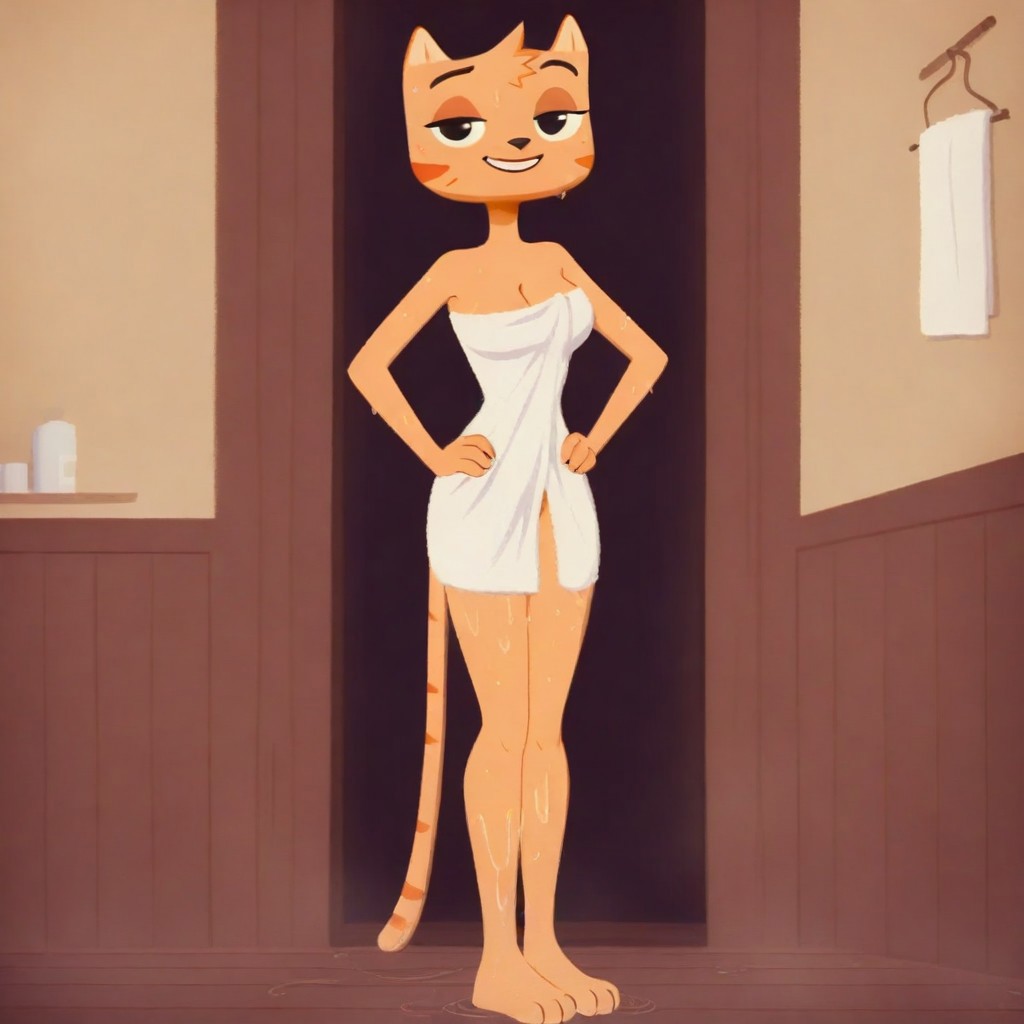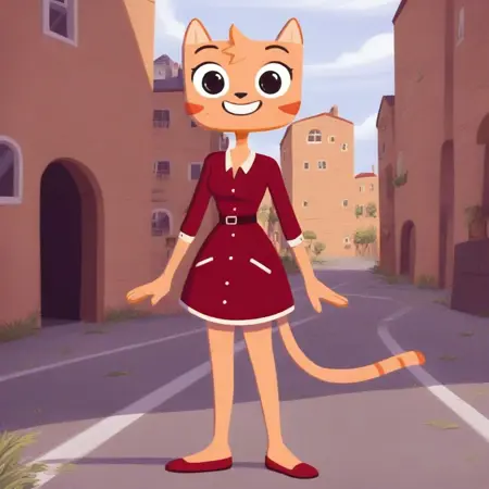 Nimfa, 1girl, anthro, cat tail, red dress, flats, white tank top, red short shorts, dark purple sundress