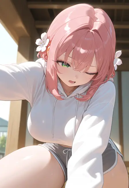彼女の外見タグ: 1girl, solo, long hair, large breasts, green eyes, pink hair, hair intakes, thick thighs, hair flower, medium hair,