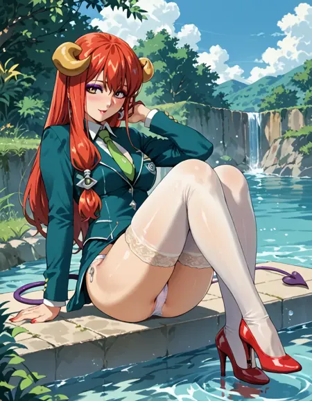 카레라, 립스틱, 빨간 눈, 장갑, 뾰족한 귀, 뿔, 악마 소녀, 팔꿈치 장갑, 날개, 배꼽, 복부, 악마 꼬리, 귀걸이, 단발, 하늘색 머리카락, 하이레그, 히스, 보석,