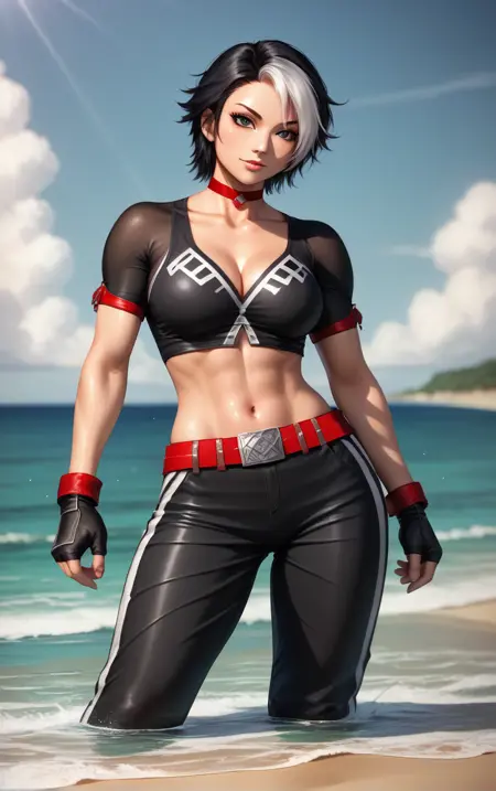 blue shorts, red gloves, white tank top, bare shoulders, fingerless gloves, tank top, cleavage, midriff, crop top, short shorts,