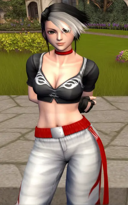 fingerless gloves, multicolored clothes, red pants, red tank top, sportswear, white gloves, bare shoulders, navel, armband, choker, cleavage, crop top, pants, sports bra, armlet, belt,