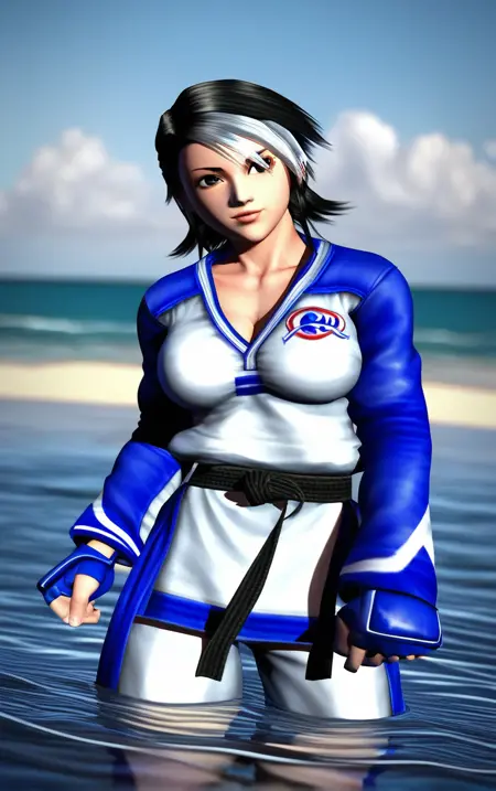 black belt, blue dress, dougi, martial arts belt, multicolored clothes, multicolored hair, belt, long sleeves, jacket, fingerless gloves, raglan sleeves, sportswear, track jacket, cleavage,