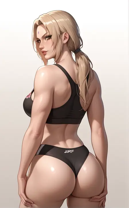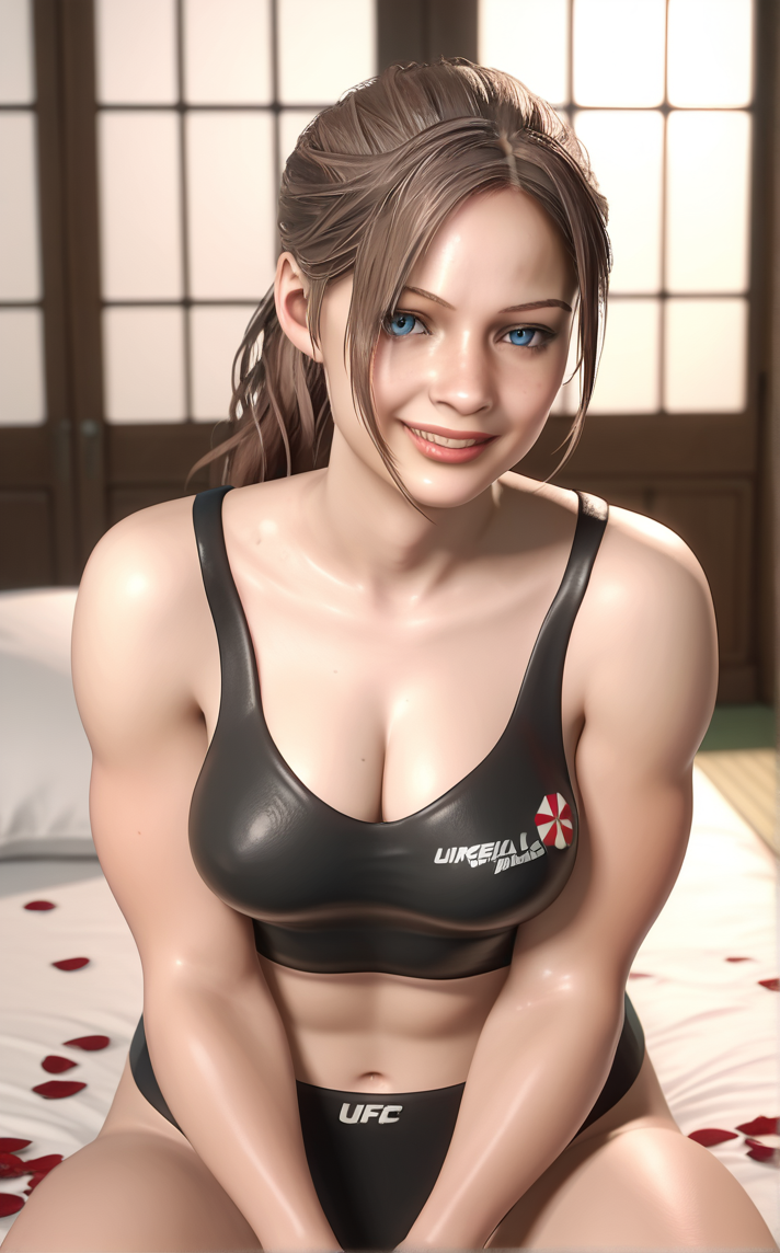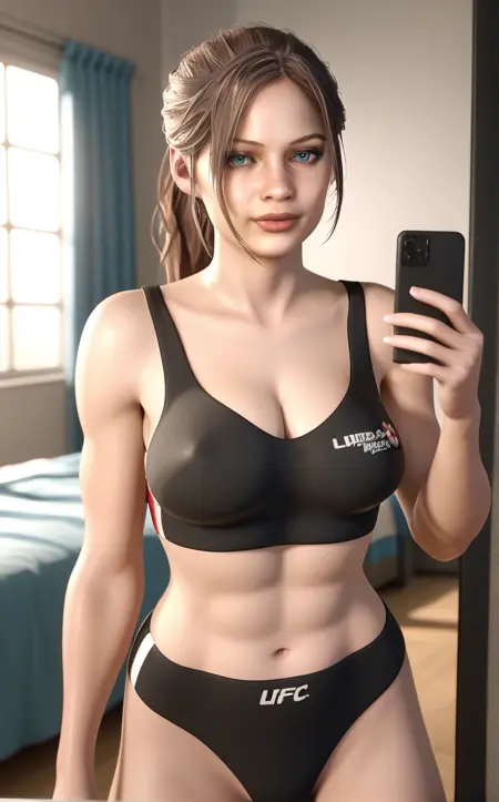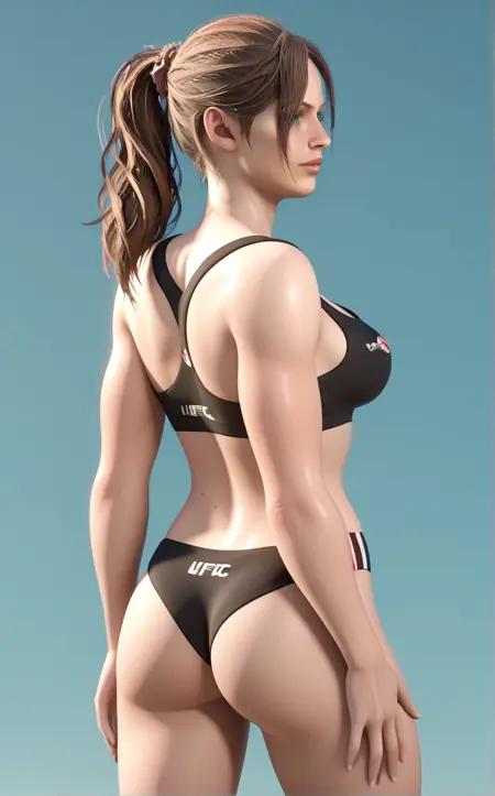 PONYXL_REvilSwimsuit_ClaireRedfield_ownwaifu, 1girl, 3d, black sports bra, black panties, english text, logo, print bra, ponytail, cleavage, medium breasts, brown hair, tank top, blue eyes, long hair, lips, navel, underwear only, bare shoulders, sportswear, nose, large breasts, midriff, black tank top,